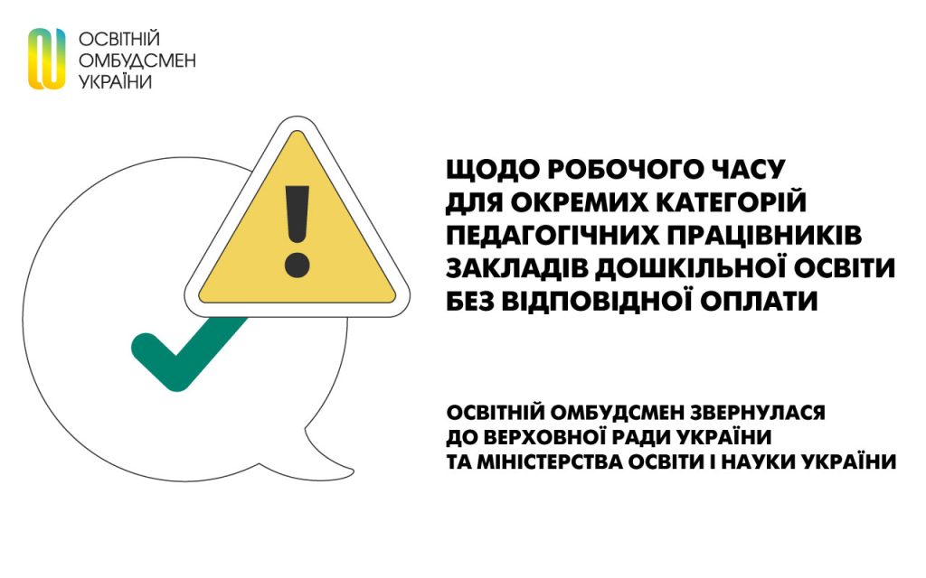 ОСВІТНІЙ ОМБУДСМЕН ЗВЕРНУЛАСЯ ДО ВЕРХОВНОЇ РАДИ УКРАЇНИ ТА МІНІСТЕРСТВА ОСВІТИ І НАУКИ УКРАЇНИ До освітнього омбудсмена надходять численні звернення від окремих категорій педагогічних працівників закладів дошкільної освіти, пов’язані зі збільшенням робочого часу в межах введення в дію нового Закону України “Про дошкільну освіту”. Кількість годин, які має відпрацювати педагогічний працівник на ставку, зросла. З 1 … Читати далі Щодо робочого часу для окремих категорій педагогічних працівників закладів дошкільної освіти без відповідної оплати
